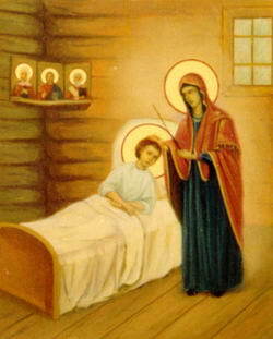 За год и десять месяцев до своей кончины, в праздник Благовещения, преподобный Серафим еще раз сподобился явления Царицы Небесной в сопровождении Крестителя Господня Иоанна, апостола Иоанна Богослова и двенадцати дев, святых мучениц и преподобных. Пресвятая Дева долго беседовала с преподобным, поручая ему Дивеевских сестер. Закончив беседу, Она сказала ему: «Скоро, любимиче Мой, будешь с нами». При этом явлении, при дивном посещении Богоматери, присутствовала одна Дивеевская старица, по молитве за нее преподобного.