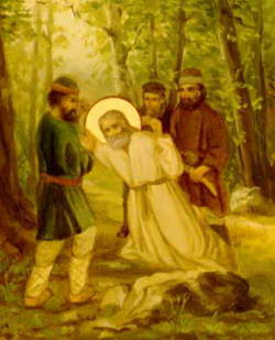 Диавол, посрамленный преподобным, задумал умертвить его и наслал грабителей. Подойдя к святому, работавшему на огороде, разбойники стали требовать от него деньги. У преподобного в это время был в руках топор, он был физически силен и мог бы обороняться, но не захотел этого делать, вспомнив слова Господа: «Взявшие меч мечом погибнут» (Мф. 26, 52). Святой, опустив топор на землю, сказал: «Делайте, что вам надобно». Разбойники стали бить преподобного, обухом проломили голову, сломали несколько ребер, потом, связав его, хотели бросить в реку, но сначала обыскали келию в поисках денег. Все сокрушив в келии и ничего не найдя в ней, кроме иконы и нескольких картофелин, они устыдились своего злодеяния и ушли. Преподобный, придя в сознание, дополз до келии и, жестоко страдая, пролежал всю ночь.